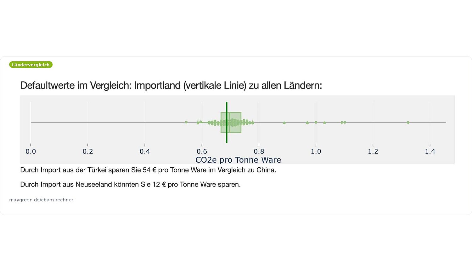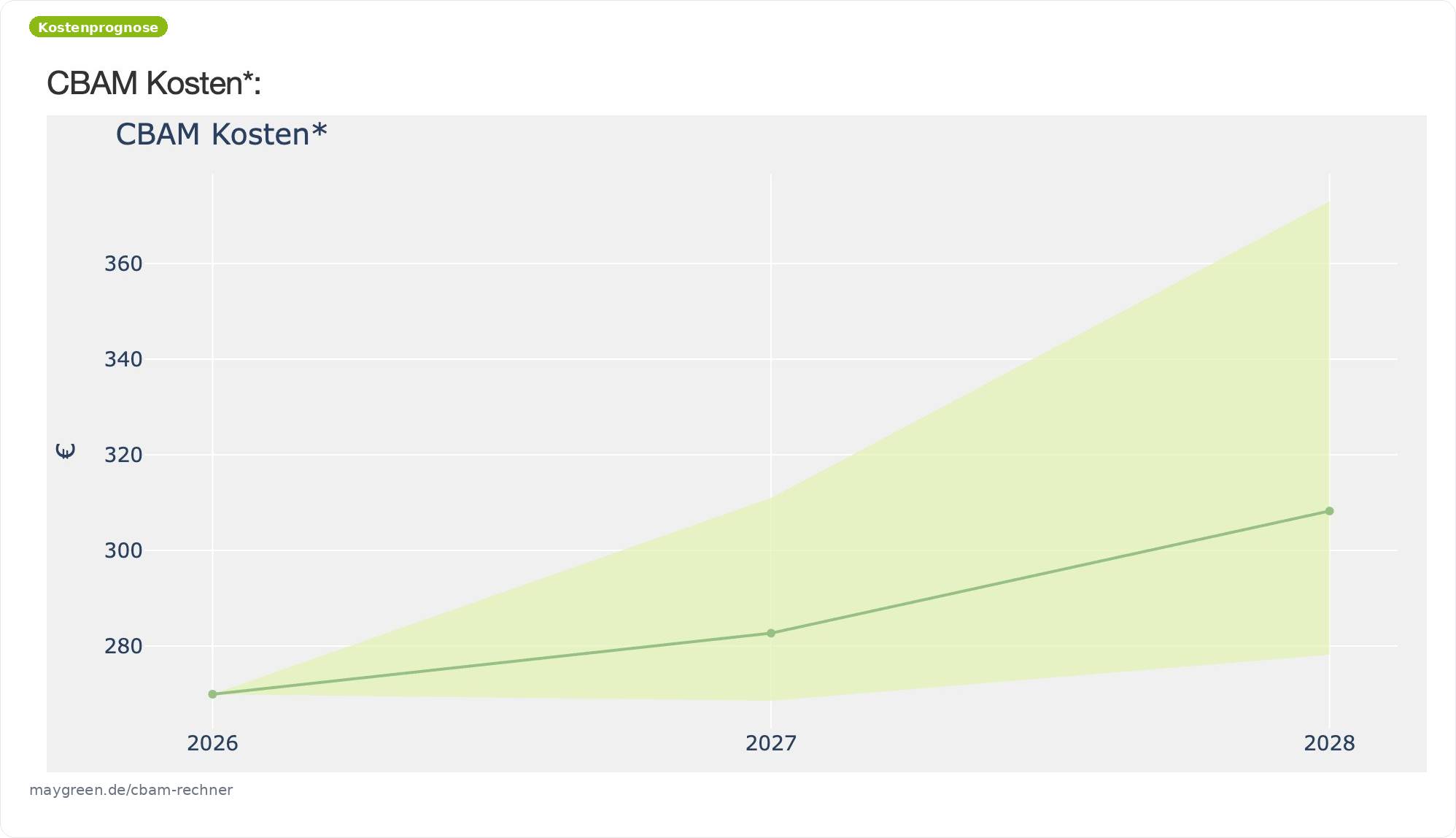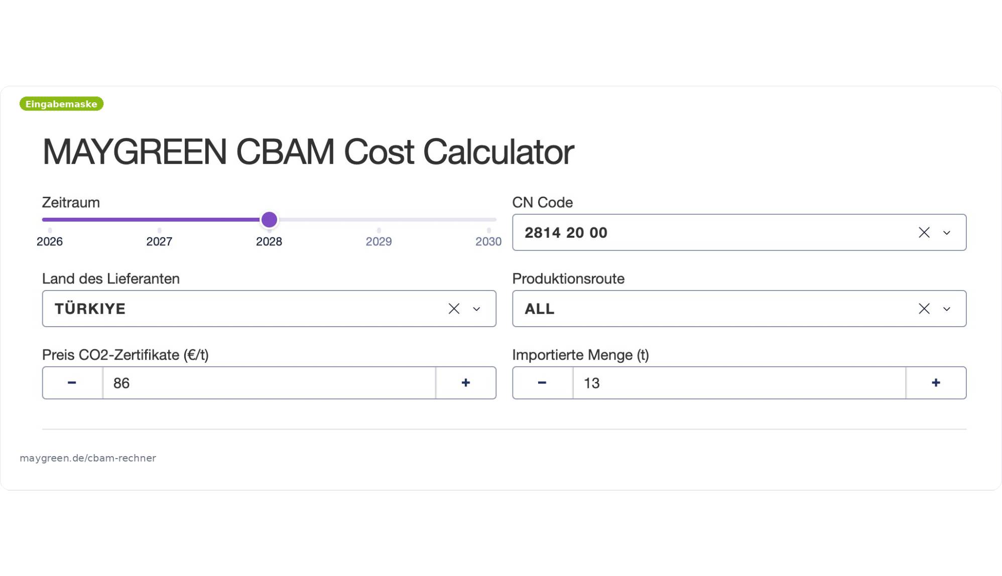 CBAM-Compliance erfordert mehr als eine Schätzung. Der MAYGREEN CBAM-Rechner verarbeitet Ihre realen Importdaten, identifiziert Kostentreiber und prognostiziert Ihre CBAM-Kosten auf Basis aktueller Standardwerte.